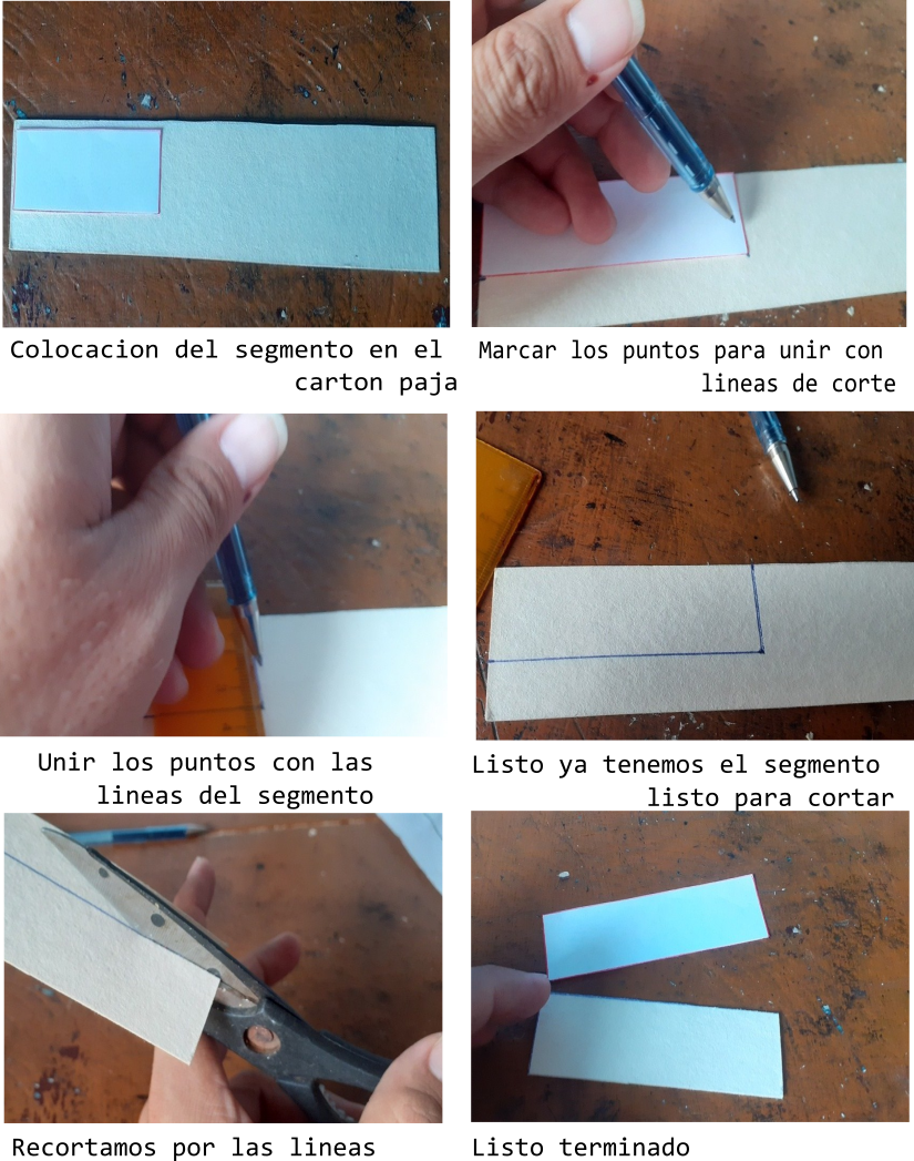 3. El proceso de calcar todos los segmentos en el carton paja, para este proceso debes contar con un boligrafo y una escuadra o regla y tijeras o otro elemento de corte, tenga precaucion con los elementos de cortes. Este paso deben repetirlo hasta tener listo los 7 segmentos o sea las base de cada uno.
